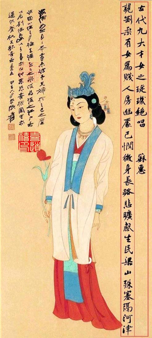 蘇惠,字若蘭,十六國時(shí)期東扶風(fēng)人(現(xiàn)今陜西咸陽武功人),生于公元357年。若蘭容貌秀麗,舉止嫻雅。其夫竇滔因厭戰(zhàn)違軍令,被貶配流沙,邂逅歌妓趙陽臺(tái),納為偏房。后竇滔奉旨鎮(zhèn)襄陽,本欲攜妻妾同往,可蘇蕙為納妾之事情閾憤拒,竇惟攜妾赴任。蘇蕙孤守空閨,日久,甚感寂空難耐。其便吟詩作文以遣孤寂時(shí)光。