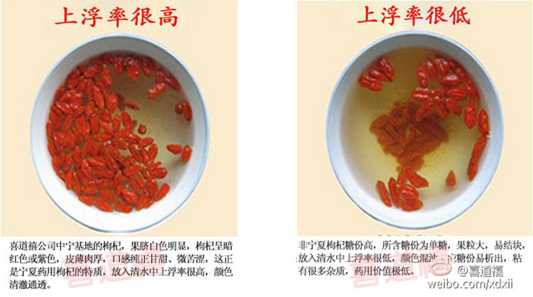 ■泡水:正宗寧夏枸杞含有適度的枸杞多糖,內(nèi)比重恰到好處。水泡法:將枸杞泡水,看看有沒(méi)有下沉,及水色情況;如果發(fā)現(xiàn)大量枸杞下沉,則表示不是寧夏枸杞,如果水色變成鮮紅色,則要注意染色和熏制處理,淡黃色表示正常。