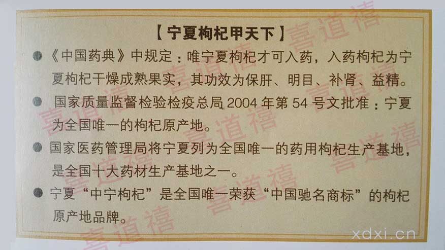 由于獨特的地理、氣候條件及悠久的栽培歷史,寧夏不僅是全國唯一的枸杞原產地,也是全國唯一的藥用枸杞生產基地,同時寧夏枸杞還是唯一用寧夏地域名稱命名的道地珍貴中藥材。